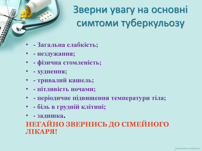 Туберкульоз не обирає за статусом, але ми обираємо – бути обізнаними та здоровими. Якщо ви помітили схожі симптоми у себе чи близьких – просто зверніться до сімейного лікаря. Це звичайний крок відповідальної людини.